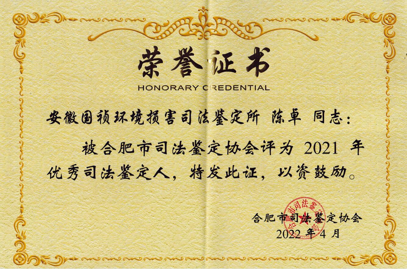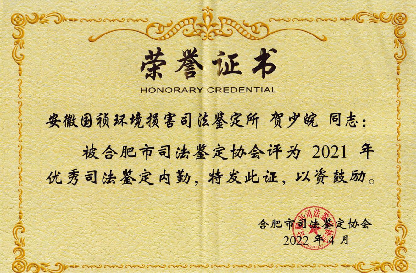 该证书旨在表彰2021年以来对合肥市司法鉴定工作做出突出贡献的优秀个人。陈卓同志工作中顾全大局,擅于克难,并于2021年被聘为全国检察机关生态环境公益诉讼技术专家,被授予“优秀司法鉴定人”荣誉称号;陈姣同志技术过硬,勤于钻研,曾参与多项司法鉴定项目工作被授予“优秀司法鉴定助理”荣誉称号;贺少皖同志工作扎实认真,在平凡的工作岗位上兢兢业业被授予“优秀司法鉴定内勤”荣誉称号。